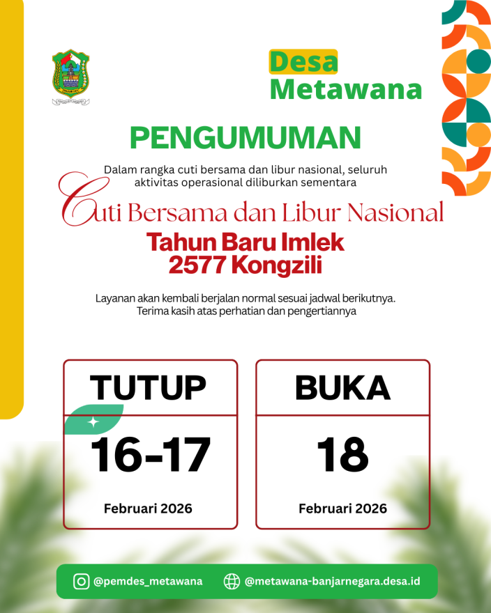 Metawana, 16 Februari 2026 — Pemerintah Desa Metawana mengumumkan kepada seluruh masyarakat bahwa dalam rangka memperingati Tahun Baru Imlek 2577 Kongzili, pelayanan di Kantor Desa Metawana akan ditutup sementara pada hari cuti bersama dan libur nasional yang telah ditetapkan oleh Pemerintah Republik Indonesia.